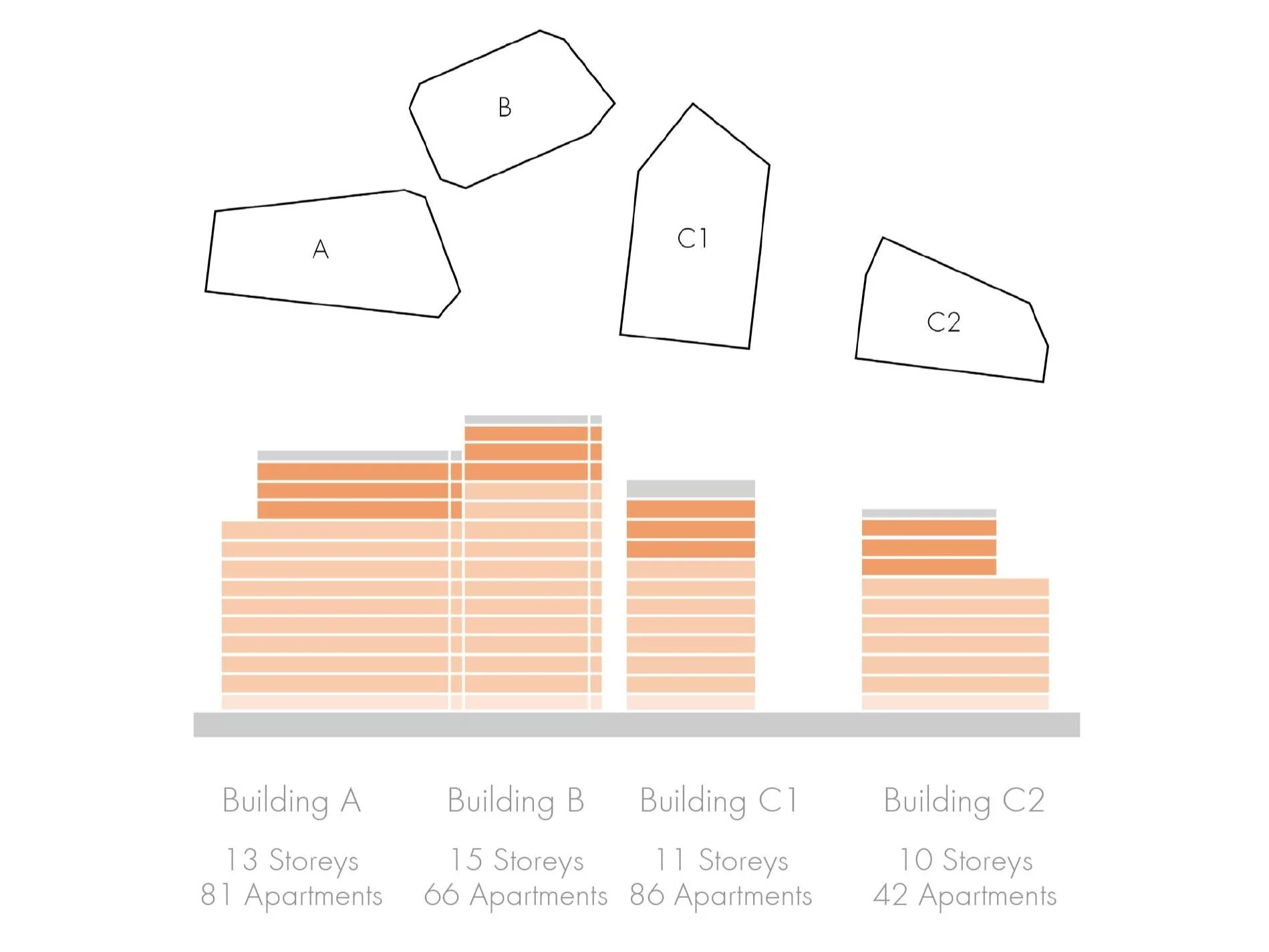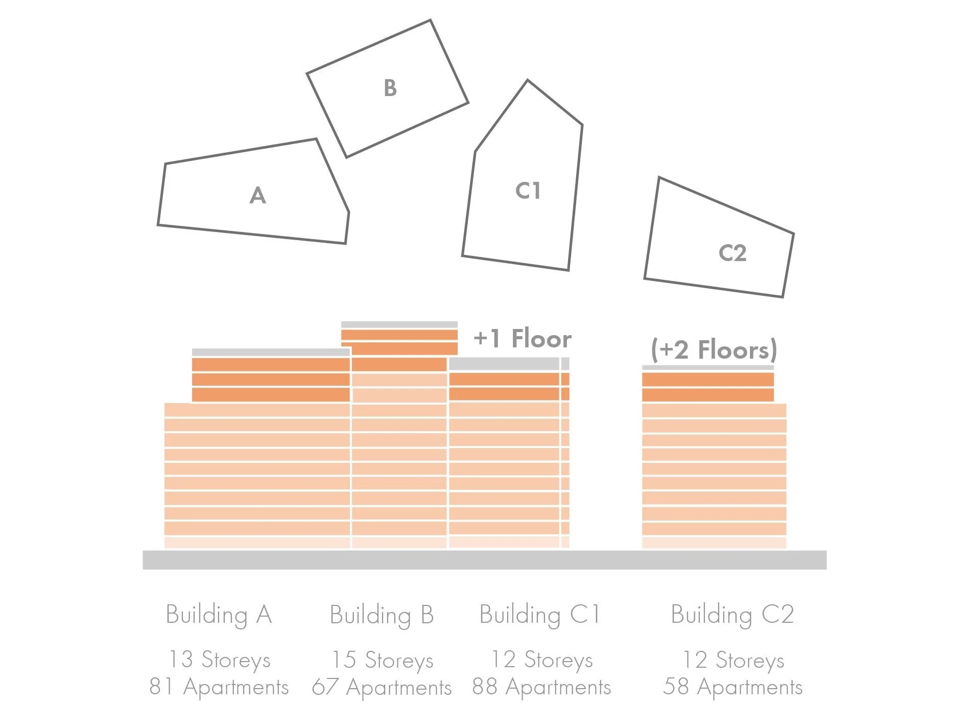 Buildings A, B, C1 and C2 will have 13, 15, 12 and 12 storeys respectively.